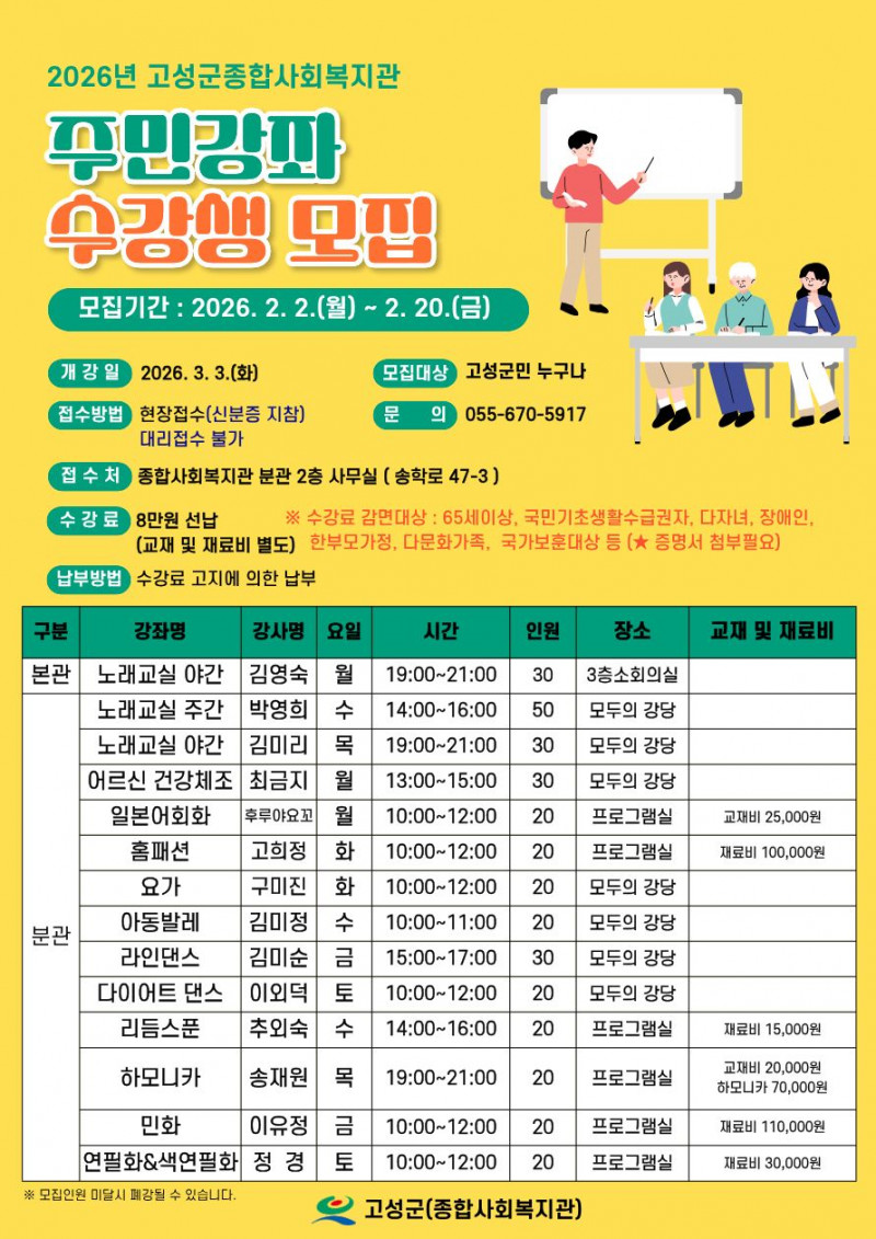 고성군종합사회복지관에서는 2026년 주민강좌 수강생을 모집합니다 고성군민들의 많은 참여바랍니다