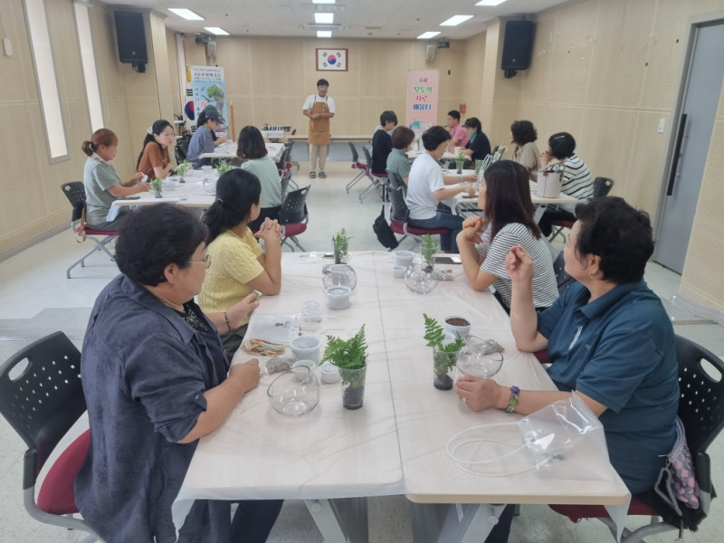 수업은 초록작업실 강경주 강사의 재능기부로 열렸으며, 참가자들은 테라리움과 친환경 식물의 이점에 대해 배우고, 자연소재를 활용해 가을 감성을 담은 테라리움을 직접 제작하는 시간을 가졌다.