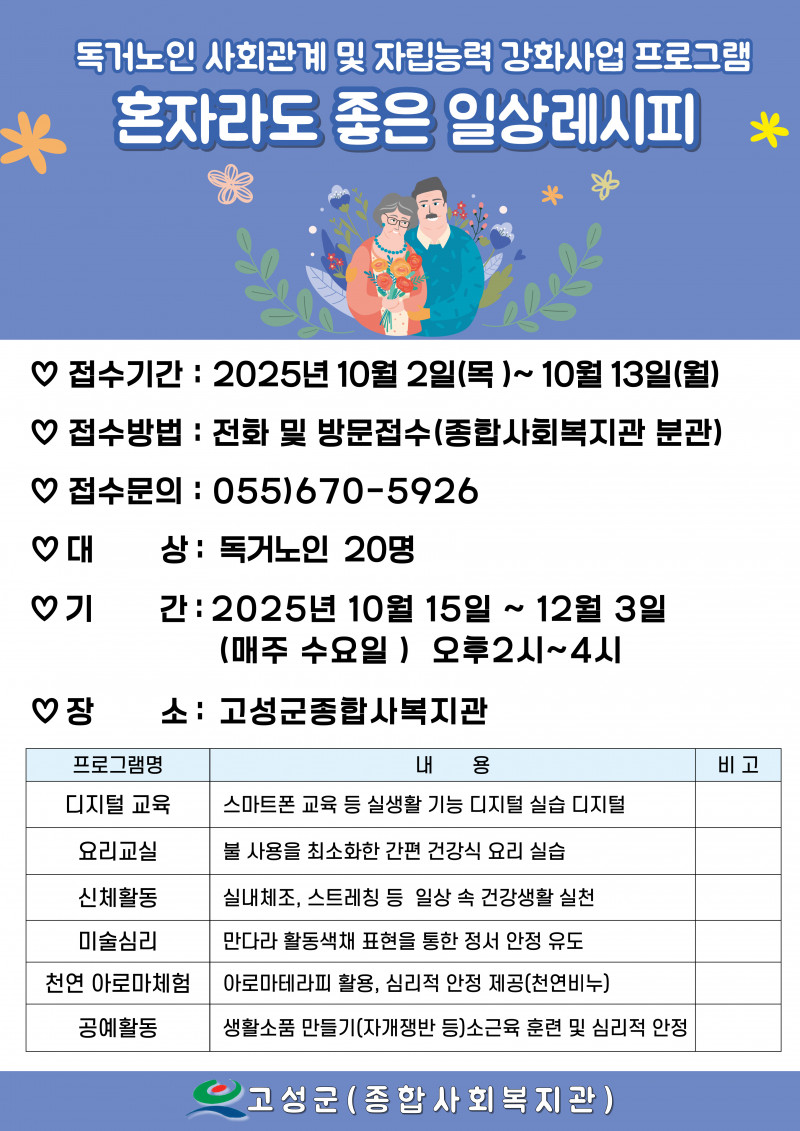 고성군(군수 이상근)은 10월2일(목)부터 10월13일(월)까지 고성군종합사회복지관에서 독거노인 어르신을 대상으로 독거노인 자립 및 사회관계 형성 프로그램 ‘혼자라도 좋은 일상레시피’ 참여자를 모집한다고 전했다.