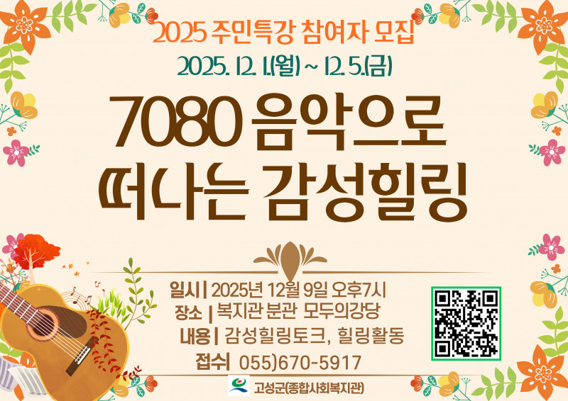 고성군(군수 이상근)에서 운영 중인 고성군종합사회복지관에서는 2025년 12월 9일 19시 종합사회복지관 분관 모두의 강당에서 고성군민을 대상으로 7080 음악으로 떠나는 감성 힐링이라는 주제로 특강을 진행한다.