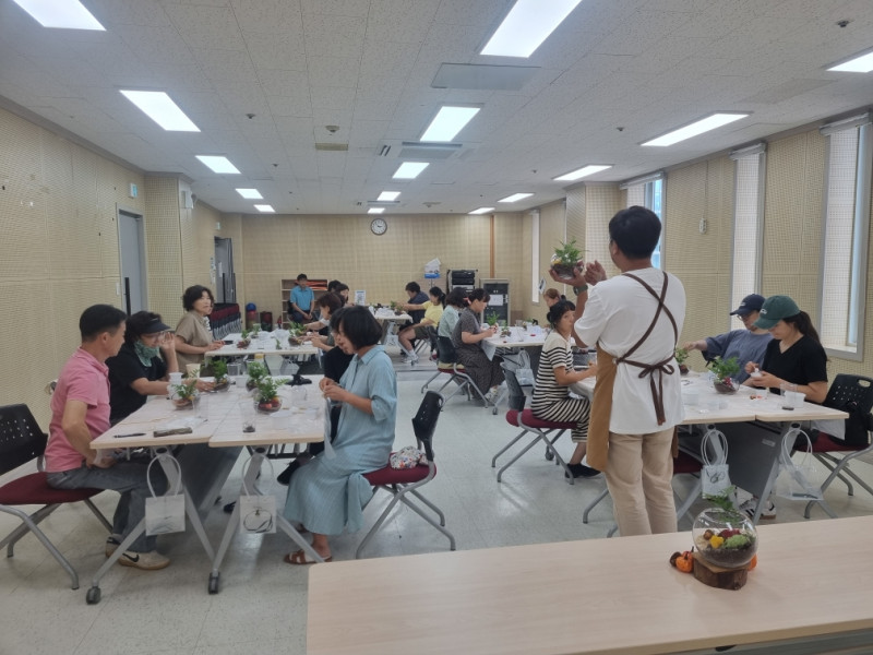수업은 초록작업실 강경주 강사의 재능기부로 열렸으며, 참가자들은 테라리움과 친환경 식물의 이점에 대해 배우고, 자연소재를 활용해 가을 감성을 담은 테라리움을 직접 제작하는 시간을 가졌다.