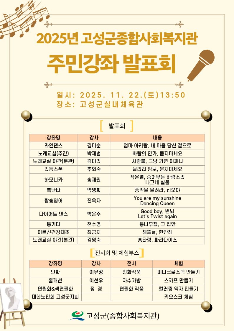 고성군(군수 이상근)에서 운영 중인 고성군종합사회복지관에서는 11월 22일 (토) 14시부터 고성군실내체육관에서 수강생 및 지역주민을 대상으로 2025년 주민강좌 발표회 및 전시회를 개최한다.